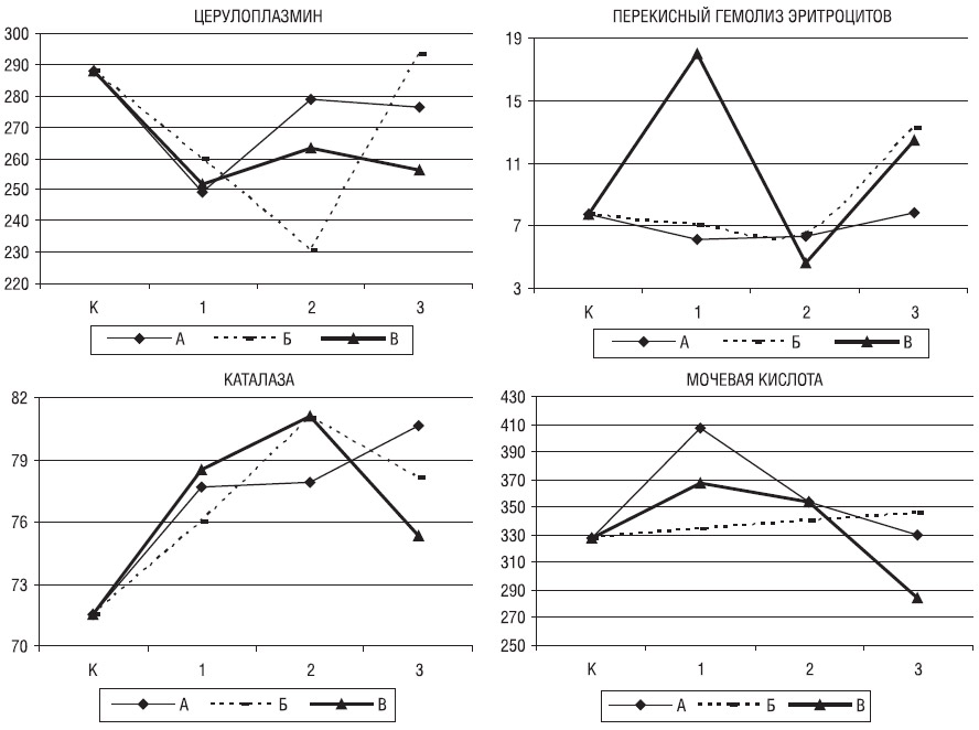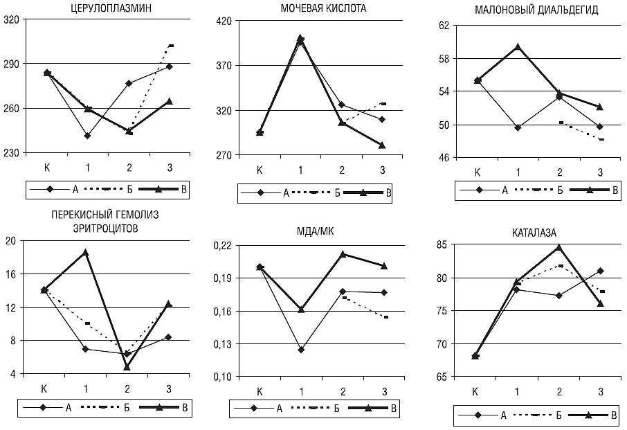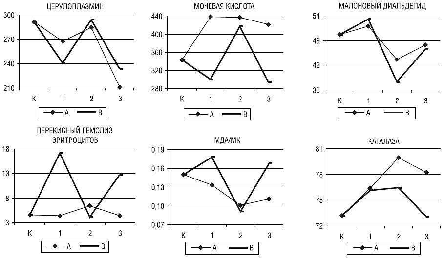 Методы. С помощью фотометрирования при длине волны 410 нм определяли активность КАТ эритроцитов (%) в реакции перекиси водорода с молибденом, при длине волны 540 нм — перекисный гемолиз эритроцитов (ПГЭ, %) в реакции аутоокисления липидов эритроцитарных мембран в буферном растворе (Горячковский А.М., 1998), при длине волны 670 нм — МК эритроцитов (мкмоль/л) фосфорновольфрамовым методом (Тиц Н.У. (ред.), 1997), при длине волны 540 нм — ЦП сыворотки крови (мг/л) по методу Равина в реакции окисления р-фенилендиамина (Камышников В.С., 2002), при длине волны 540 нм — МДА эритроцитов (мкмоль/л) в реакции взаимодействия с тиобарбитуровой кислотой для вычисления отношения МДА/МК как характеристики баланса окислительно-антиоксидантных процессов (Камышников В.С., 2002).
