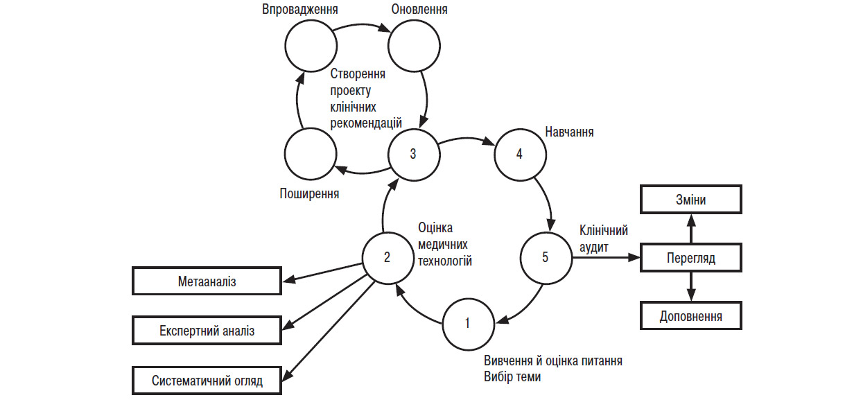 Процес створення клінічних рекомендацій є багатоетапним і структурованим (рисунок). Починається він з вибору теми клінічних рекомендацій, всебічного вивчення й оцінки цього питання. Мабуть, найважливішим етапом є забезпечення об’єктивності оцінки медичних технологій, методів і способів лікування, що мають бути включені в клінічні рекомендації на засадах доказової медицини. Цей етап роботи проводить мультидисциплінарна група дослідників, які аналізують і відбирають джерела наукової інформації з застосуванням спеціальних правил. Так, до клінічних рекомендацій включають висновки метааналізів, систематичних оглядів, а також досліджень, проведених відповідно до вимог «золотого стандарту для клінічних випробувань» — рандомізованих контрольованих подвійних та потрійних сліпих досліджень із плацебо. Систематизований пошук літератури здійснюється за визначеними джерелами, якими є електронні бази даних (Cochrane Library, MEDLINE, EMBASE, CINAHL тощо), реєстри досліджень (Current Controlled Trials, http://www.controlled-trials.com; National Research Register, http://www.nrr.nhs.uk; National Cancer Institute, http://www.cancer.gov), електронні журнали (Science Direct, Ingenta, Journal@Ovid), матеріали конференцій (Index to Conference Proceeding, ISI Proceedings), дисертації (Digital Dissertations, Index to Theses).