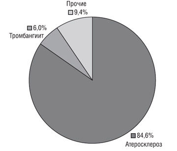 По своей структуре они разделены на большие ампутации (ампутации бедра, голени, плеча, предплечья, экзартикуляции в тазобедренном суставе) и малые ампутации (ампутации стопы, кисти, пальцев конечности). После реконструктивных операций выполнено 160 ампутаций нижних конечностей (больших и малых). В ходе исследования выделена одна группы больных — высокие (большие) ампутации нижних конечностей после реконструктивных операций — 120 больных (вторичные ампутации). Первичной мы считали ампутацию, если больному ранее не проводили какие-либо операции, направленные на сохранение конечности. Вторичной — когда подобные операции проводились. Средний возраст больных колебался от 30 до 78 лет и в среднем составил 55,2±8,9 года; большинство больных — мужчины, преимущественно в возрасте старше 50 лет. В структуре нозологий больших ампутаций конечностей после реконструктивных операций (рис. 1) ведущее место принадлежит атеросклерозу (84,6%). Судьба больных изучалась путем непосредственного контакта с больным и его родственниками, анализом медицинской документации, рассылкой анкет. Отдаленные результаты прослежены в период от 6 до 120 мес.