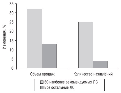 Рис. 3. Увеличение объема продаж и количества назначений в США в 2000 г. по сравнению с 1999 г.