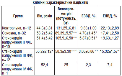 Всі обстежені хворі перебували на стаціонарному лікуванні в Інституті кардіології ім. М.Д. Стражеска АМН України або були запрошені за даними архіву нашого інституту. Критеріями включення в дослідження були наявність стабільної стенокардії напруження, можливість виконувати тест із дозованим фізичним навантаженням (ДФН). У кожного хворого вивчали анамнез і проводили рутинне клініко-інструментальне обстеження. Систолічний (САТ) і діастолічний (ДАТ) артеріальний тиск вимірювали за стандартною методикою. Нами обстежено 32 пацієнти з ішемічною хворобою серця (ІХС) (основна група). З них стабільну стенокардію напруження II функціонального класу (ФК) виявили у 19 хворих, III ФК — у 12 і IV ФК — в 1. До контрольної групи увійшли 12 пацієнтів з нейроциркуляторною дистонією, остеохондрозом хребта або гіпертонічною хворобою I стадії та без виражених факторів ризику ІХС. Середній вік обстежених основної групи — 53,2±5,42 року, контрольної — 44,6±3,81 року. Ми не залучали до дослідження хворих, що мали такі протипоказання до проведення ДФН: гострий коронарний синдром, гострий тромбофлебіт, недостатність кровообігу IIА–III стадії, хронічна аневризма серця чи судин, виражена артеріальна гіпертензія (САТ понад 180 мм рт. ст. і ДАТ >110 мм рт. ст.), облітеруючий атеросклероз нижніх кінцівок з переміжною кульгавістю. Також стежили, щоб протягом не менше ніж за півроку до початку дослідження у схему лікування жодного з хворих не входили лікарські засоби, що вірогідно поліпшують функцію ендотелію: препарати L-аргініну, статини, карведилол, хінаприл, раміприл, периндоприл.