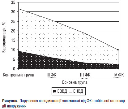 У підгрупі хворих зі стабільною стенокардією напруження II ФК ЕЗВД зменшується і становить 5,87±0,51 (р<0,05). У той же час ЕНВД все ще статистично значущо не відрізняється від такої у контрольній групі. У підгрупі хворих зі стабільною стенокардією напруження III ФК ЕЗВД продовжує прогресивно зменшуватися — 3,06±0,86 (р<0,01). У цієї категорії хворих починає знижуватися також ЕНВД — 15,32±1,57 (р<0,05). На наш погляд, цей факт заслуговує особливої уваги. У класичних роботах D.S. Celermajer та співавторів (1992; 1994a, b), які, правда, були присвячені вивченню впливу факторів ризику ІХС на ендотелій, ЕНВД ніколи не знижувалася навіть на фоні дуже низької ЕЗВД (чи навіть вазоконстрикції). З таблиці та рисунка видно, що в хворого зі стабільною стенокардією напруження IV ФК ЕНВД істотно пригнічена.