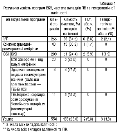 Всього внаслідок 554 циклів ЕКЗ настало 155 вагітностей, з яких 9 виявилися позаматковими (у 8 випадках плідне яйце містилось у матковій трубі, в одному — у цервікальному каналі шийки матки) та 3 — гетеротопічними. З останніх у двох випадках виявили по одному плідному яйцю у матці та в матковій трубі, у третьої жінки в матці було два плідних яйця, ще одне — у матковій трубі. Таким чином, частота настання ПВ із числа всіх випадків вагітності після ЕКЗ становила 5,8%, що істотно більше, ніж така серед спонтанних вагітностей у популяції (близько 1% за даними літератури). Після рутинного IVF з 88 вагітностей 6 (6,8%) були позаматковими, в тому числі 2 (2,1%) гетеротопічних, а після процедури ICSI з 67 вагітностей ектопічними виявились 2 (3,0%), одна з яких була гетеротопічною. Частота ПВ після рутинного IVF була значущо вища, ніж після ICSI (p<0,05). Потрібно відзначити, що серед 17 вагітностей після біопсії яєчка (TESE) ПВ не було.