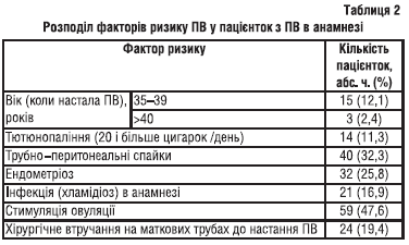 У наших пацієнток з ПВ в анамнезі старший вік та тютюнопаління відзначали досить рідко. Ендометріоз та аденоміоз фіксували частіше — у 32 (25,8%) жінок. В частині випадків наявності ендометріозу виявляли також трубно-перитонеальні спайки. Стимуляцію овуляції в анамнезі хворих із ПВ в минулому виявляли майже у 50%. Але встановити, чи ПВ сталась внаслідок стимульованого циклу, нам не вдалось, тому що ці дані в історіях хвороби були відсутні.