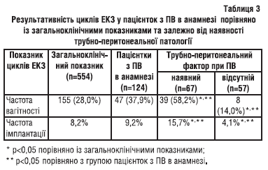 У більшості — 67 (54%) пацієнток — відзначали ураження трубно-перитонеального сегмента (трубно-перитонеальні спайки, хірургічне втручання на маткових трубах, хламідійну інфекцію в анамнезі, ендометріоз), деякі фактори комбінувалися. Але у значної кількості (57 (46%)) пацієнток такий безсумнівний етіопатогенетичний фактор виникнення ПВ, як трубно-перитонеальне ураження, не виявляли. У зв’язку з цим ми розділили пацієнток з ПВ в анамнезі на тих, у кого трубно-перитонеальний фактор виявляли, і на тих, у кого його не було. Результативність циклів ЕКЗ у 124 жінок залежно від наявності трубно-перитонеальних патологічних процесів наведена в табл. 3.