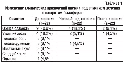 Средний исходный уровень гемоглобина у обследованных пациентов составлял 98,71±6,27 г/л, эритроцитов — 3,22±0,28·1012/л, сывороточного железа — 8,44±2,14 мкмоль/л. 18 (81,8%) больных предъявили жалобы на нарастающую слабость, головную боль, одышку при физической нагрузке, утомляемость и головокружение, 2 (9,1%) пациента — на учащенное сердцебиение, 2 (9,1%) — на искажение вкуса. Через 2 нед на фоне применения препарата Гемоферон у большинства больных отмечено улучшение самочувствия, уменьшение клинических проявлений анемии (табл. 1). В конце наблюдения (через 4 нед) субъективные проявления анемии исчезли практически у всех пациентов.