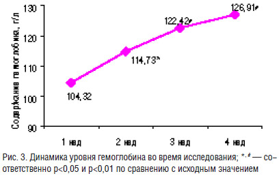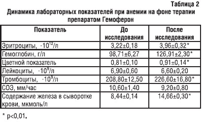 Терапевтическая эффективность препарата Гемоферон подтверждена статистически значимым улучшением показателей крови (табл. 2). Так, уже через 4 нед данный эффект достигал максимальной выраженности и обусловливал повышение уровня гемоглобина, эритроцитов и железа в сыворотке крови от исходного уровня соответственно на 28,2± 2,3 г/л, или на 28,6% (р<0,01), на 0,74±0,42·1012/л, или на 23% (р<0,01), на 6,22±0,3 мкмоль/л, или 73,7% (р<0,01). Выявленное повышение данных показателей крови свидетельствует о том, что препарат эффективен у этой категории больных.