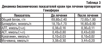 Эффективность терапии в конце исследования оценивалась как очень хорошая с точки зрения 70% пациентов, хорошая — 30%. В результате стандартного базисного лечения по поводу основных заболеваний в сочетании с препаратом Гемоферон у 2 (9,1%) пациентов были зарегистрированы побочные эффекты в виде диспепсии, которые носили временный характер и исчезали при снижении дозы, что не потребовало отмены препарата. Негативного влияния препарата на функциональное состояние печени, почек, крови не выявлено (табл. 3).