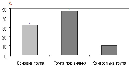 Рис. 2. Частка вагітних, у яких виявлено клінічну картину загрози переривання вагітності за даними УЗД (*p<0,05 порівняно з контролем)