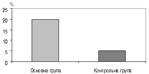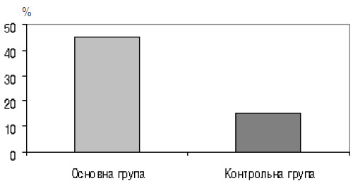 Наступним етапом у комплексі досліджень було імунологічне. При загальному аналізі показників імунограм у 18 (45%) жінок основної групи і лише у 6 (15%) жінок контрольної групи ми виявили зміни імунітету (рис. 4), що характеризують неадекватну реакцію материнського організму на розвиток плода вже в ранні терміни вагітності і дають можливість виокремити цей контингент у групу ризику за імунологічними показниками (доклінічна стадія загрози переривання вагітності).