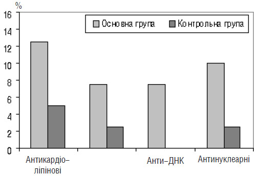 Подальше обстеження в нашому комплексі для визначення ризику невиношування вагітності включало дослідження крові на наявність АФАТ і антитіл до ХГЛ. Антикардіоліпінові антитіла зафіксовано у 5 (12,5%) пацієнток основної групи, у 2 (5%) — контрольної групи, антифосфатидилсеринові — у 3 (7,5%) і 1 (2,5%) відповідно, анти-ДНК антитіла — тільки у 3 (7,5%) жінок основної групи, антинуклеарні — у 4 (10%) і 1 (2,5%) відповідно, антитіла до ХГЛ — у 8 (20%) жінок основної групи і лише у 2 (5%) — контрольної (рис. 5, 6). Дослідження зазначених показників в групі порівняння не проводили, оскільки стандартна методика не передбачає визначення або корекції доклінічної стадії загрози переривання вагітності. Наявність АФАТ і/або антитіл до ХГЛ разом з іншими лабораторними змінами, зокрема з показниками імунограм і гормональних досліджень, ми розцінювали як доклінічну стадію загрози переривання вагітності.