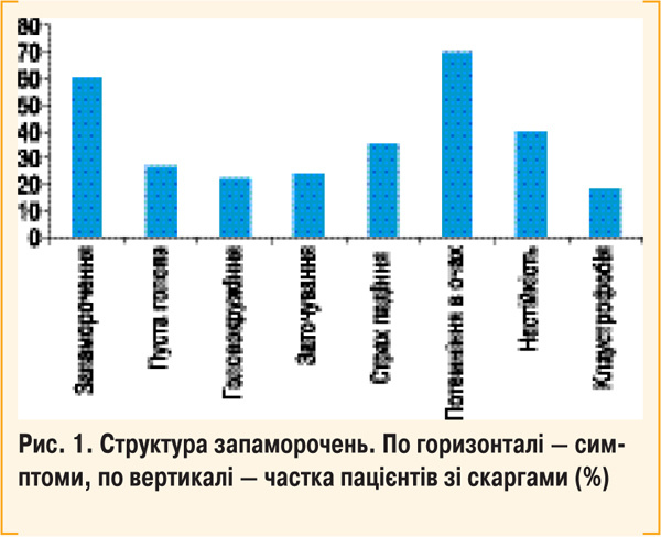Дещо інший розподіл скарг відзначали у обстежених в 1990-х рр. (621 хворий): у структурі скарг затьмарення чи потемніння в очах (black-outs) та запаморочення (dizziness) були типовими для 70 і 60% хворих відповідно, тоді як чітке відчуття руху — лише у 22% пацієнтів, що вказує на переважання запаморочень над головокружінням (рис. 1).