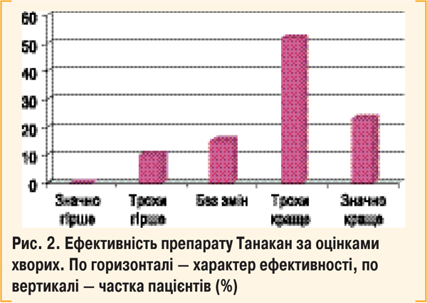 Уже через 1 міс терапії препаратом Танакан 49 учасників ліквідації наслідків аварії на ЧАЕС відзначили позитивний ефект. Препарат призначали в дозі 120 мг/добу. У динаміці лікування практично не виявлено негативних сторонніх ефектів. Зате відзначали значне і стійке покращання загального самопочуття, яке означало зменшення вираженості головного болю, запаморочення та порушень координації рухів, регресії загальної слабкості. Спостерігали також покращання у психоемоційній сфері хворих, регресував ступінь вираженості вестибуло-атактичного, сенсорного, цефалгічного, вегетативного синдромів. Для документування цього спочатку вивчали суб’єктивну оцінку ефективності (рис. 2).