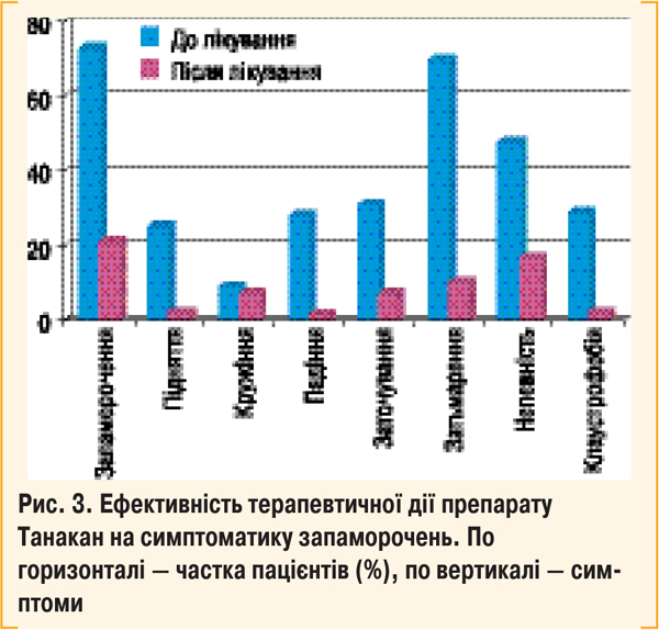 Стандартизацію досліджень щодо поліпшення стану здоров’я хворих почали з індексу вираженості (Ів) запаморочення, який знизився від 3,3 до 0,56 (р<0,05). На запаморочення Танакан діяв відчутно — ця скарга знизилася від 74 до 20% хворих. Особливо ефективним Танакан виявився у тому разі, коли хворі скаржилися на випадки падіння (кількість хворих зменшилася з 29% до лікування до 2% після проведеної терапії) та клаустрофобії (кількість хворих зменшилася з 29% до лікування до 2% після проведеної терапії) (рис. 3). Аналогічні дані стосуються нечітких відчуттів гойдання, втрати рівноваги, які також відносять до запаморочень та порушень координації рухів. Лікування виявилось ефективним в усіх варіантах причини запаморочень. При цьому хворі вказували, що ортостатичні запаморочення (до лікування скаржилися 16% хворих) зникли зовсім. Найменших змін зазнали запаморочення при рухах головою, які зменшилися з коефіцієнтом динаміки К=63,64%, найбільших змін після ортостатичних запаморочень зазнали скарги на запаморочення при нахилах К=81,67%.