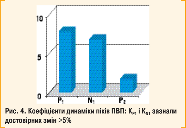 Для документації об’єктивних змін у вестибуло-кірковій проекції використані також дані, отримані за допомогою реєстрації ЛП ПВП. Коефіцієнти динаміки для піків становили: КР1 — 7,79%, КN1 — 6,76%, КР2 — 1,69% (рис. 4). Слід звернути увагу на те, що найбільших змін зазнали ЛП піка Р1. Це може свідчити про переважно периферичний механізм дії препарату.