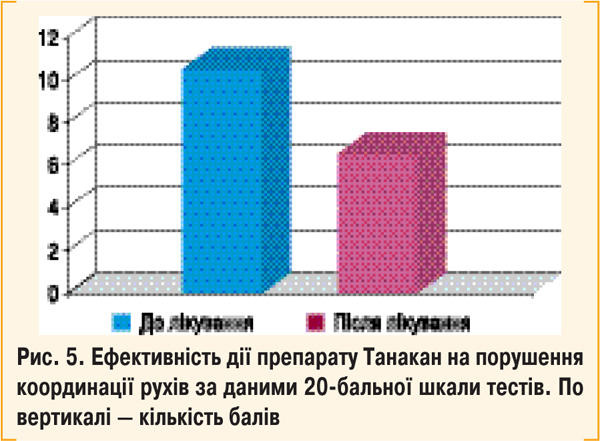 Ефективність терапії препаратом Танакан підтверджено при вивченні вестибуломоторних реакцій. Порушення координації зменшилося з 10,6±3,2 до терапії до 6,5±2,8 бала після лікування. Ця картина повторюється і щодо окремих тестів. Найбільш значним є результат, отриманий при проведенні випробування Уемури: зниження відбулося від 2,6±1,4 до 1,8±1,2 бала (різниця статистично достовірна, р<0,05). За даними всіх об’єктивних проб (20-бальна шкала, ПВП) відзначають прогресивну динаміку параметрів присінкового стану, більше виражену у вестибулокірковій і менше — у вестибуломоторній проекції. При використанні критерію знаків можна говорити про статистично достовірну зміну вестибулярної функції в напрямку норми (рис. 5).