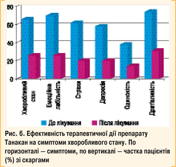 Дія препарату Танакан на показники вестибуло-лімбічної проекції, зокрема щодо вираженості психо-емоційного синдрому, свідчить про зниження практично всіх ознак захворювання. Ів знижувався: для болю голови з 2,2 до 1,2; ознак астенії — з 3,1 до 1,3; втрат свідомості — з 1,8 до 0,52; хворобливого стану — з 2,9 до 1,0. Частка пацієнтів зі скаргами на астенізацію зменшилася приблизно вдвічі в усіх проявах. Зменшилася частка пацієнтів зі скаргами на слабкість — з 84 до 37%, погіршення пам’яті — з 78 до 24%, хронічну втому — з 51 до 24%. Відсоток осіб, які відчували хворобливий стан, з коефіцієнтом >2,5 зменшився з 67 до 27%, з проявами емоційної лабільності — з 71 до 27%, фобією — з 61 до 27%, депресією — з 57 до 20%. Особливо ефективним виявився вплив препарату на прояви дратівливості: частка хворих зменшилася з 73 до 31% (рис. 6).