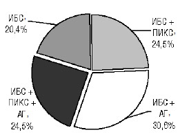 У 15 (30,6%) пациентов ИБС сочеталась с артериальной гипертензией (АГ); у 12 (24,5%) пациентов с ИБС в анамнезе по данным ЭКГ и эхоКГ был подтвержден постинфарктный кардиосклероз (ПИКС). ИБС с ПИКС в сочетании с АГ обнаружена у 12 (24,5%) больных, у 10 (20,4%) пациентов ИБС со стенокардией напряжения АГ и ПИКС не установлены (рис. 1).