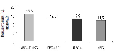 При обследовании больных этих подгрупп выявлено, что у пациентов с ПИКС концентрация ГЦ в плазме крови самая высокая и составляет 15,6± 2,6 мкмоль/л, а самая низкая у пациентов с ИБС со стенокардией напряжения без АГ и ПИКС — 11,9± 0,8 мкмоль/л. У пациентов с ИБС в сочетании с АГ уровень ГЦ составил 12,8±0,8 мкмоль/л, с ПИКС в сочетании с АГ — 12,9±0,8 мкмоль/л (рис. 2).