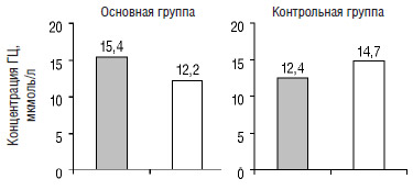 Начальная концентрация ГЦ у пациентов основной группы составила 15,4±1,3 мкмоль/л, контрольной — 12,4±0,6 мкмоль/л. После 14-дневнего лечения уровень ГЦ в плазме крови у этих больных составил: в основной группе — 12,2±0,9 мкмоль/л, в контрольной группе — 14,7±0,9 мкмоль/л. Достоверность различий составила р<0,05 (рис. 3).