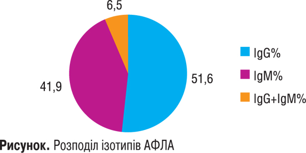 Слід зазначити, що у половини АФЛА-позитивних пацієнтів — УЛНА на ЧАЕС — виявлено одночасно як аКЛ, так і антифосфадилсеринові антитіла. Лише аКЛ виявлено у 6 обстежених пацієнтів, лише антифосфатидилсеринові анититіла — у 5 пацієнтів. Розподіл АФЛА за ізотипами імуноглобулінів наведено на рисунку.
