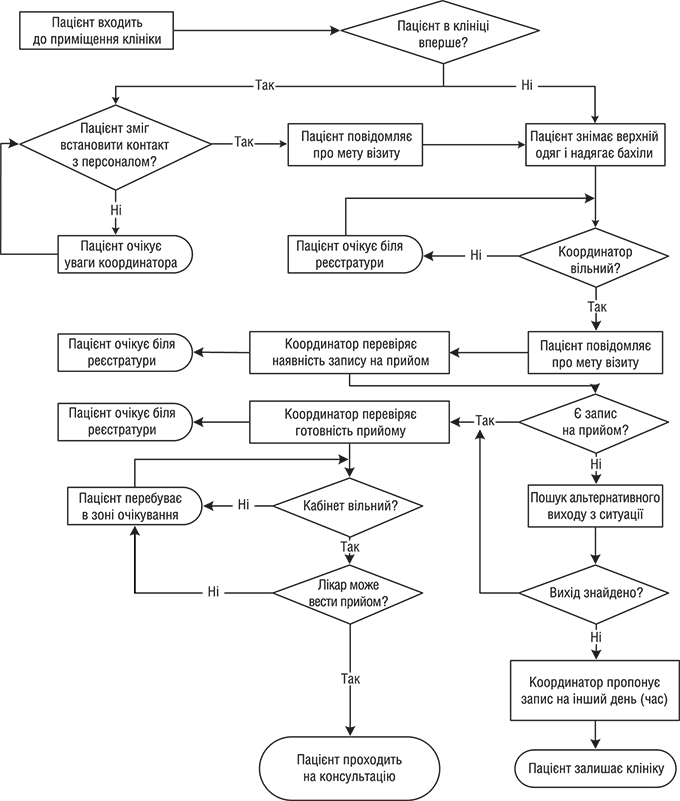 Доступність медичної допомоги та рівень задоволення пацієнтів поліклініки визначаються насамперед якістю роботи персоналу конкретного медичного закладу. Сучасні системи менеджменту якості опираються насамперед на процесний підхід, що дозволяє оцінювати існуючий стан організації робіт в закладі та планувати його зміни (Ross A. et al., 1991; Каневський О. С. та співавт., 2005; Елиферов В. Г., 2006). Приклад описання частини процесу «Амбулаторна консультація пацієнта» на дослідженому об’єкті наведено на рисунку.