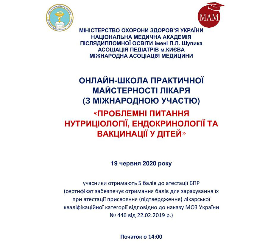 19 червня 2020 р. о 14:00 відбудеться онлайн-конференція з міжнародною участю «Онлайн-школа практичної майстерності лікаря» на тему «Проблемні питання нутриціології, ендокринології та вакцинації у дітей».
