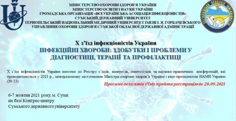 Х З’їзд інфекціоністів України внесено до Реєстру з’їздів, конгресів, симпозіумів та науково-практичних конференцій, які проводитимуться у 2021 р., затвердженого заступником міністра охорони здоров’я України і віцепрезидентом НАМН України (№ 13).