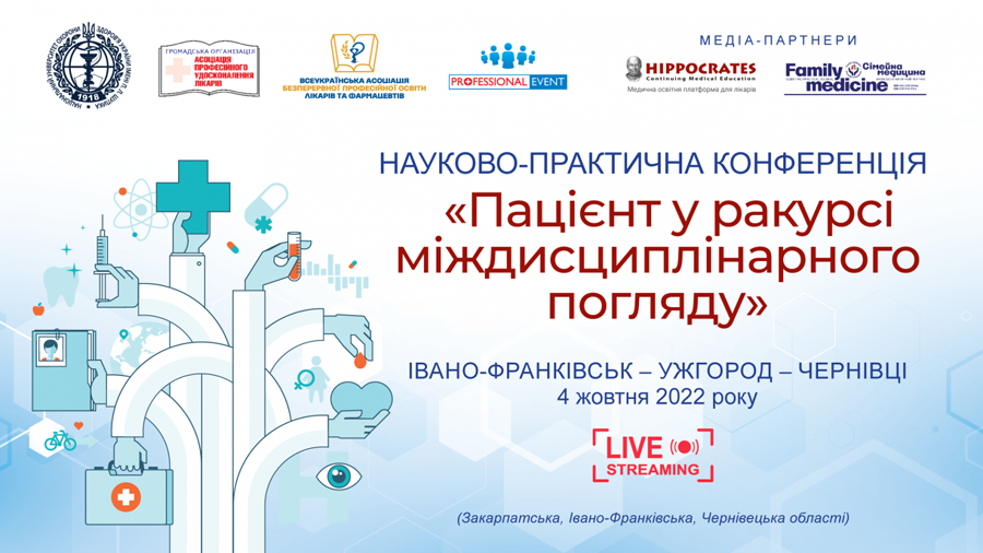 Громадська організація «Асоціація професійного удосконалення лікарів» за підтримки Національного університету охорони здоров’я (НУОЗ) України імені П.Л. Шупика ЗАПРОШУЄ БЕЗКОШТОВНО взяти участь у науково-практичній конференції «Пацієнт у ракурсі міждисциплінарного погляду», що відбудеться 4 жовтня з прямою онлайн-трансляцією наживо одразу в усіх містах і населених пунктах Закарпатської, Івано-Франківської та Чернівецької областей!