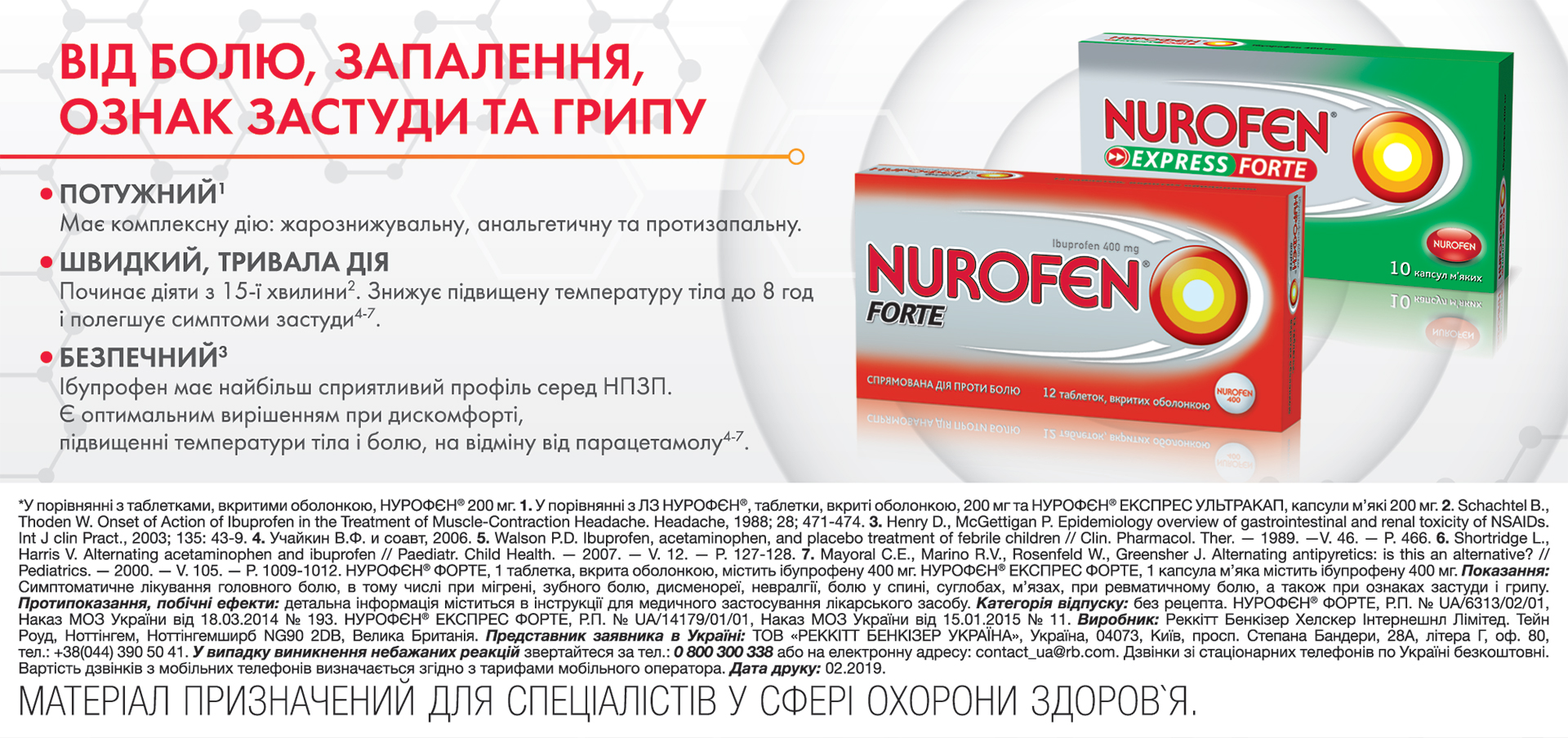 Таким чином, ібупрофен дозволяє успішно вирішити більшість проблем, пов’язаних із ГРЗ, які спричиняють дискомфорт у пацієнта. Силу і тривалість дії лікарського засобу можна вибирати, виходячи з широкої лінійки препаратів під брендом НУРОФЄН®. Завдяки достатній доказовій базі можна розраховувати на три основні терапевтичні ефекти ібупрофену — антипіретичний, протизапальний та анальгезивний — у широкому діапазоні клінічних ситуацій. При належному призначенні з урахуванням показань та протипоказань НУРОФЄН® може бути препаратом вибору у дітей та дорослих і здатний взяти на себе основне навантаження у боротьбі з цілою низкою патологій у практиці сімейного лікаря.